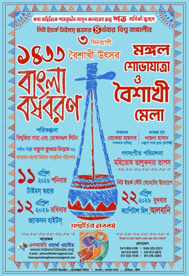 Join Us for an Unforgettable Celebration! Experience the vibrant energy of Pohela Boishakh in the heart of New York City. A spectacular fusion of tradition and modernity with a dazzling Mangal Shobhajatra, colorful processions, and the festive spirit of the Boishakhi Fair. Be part of a thousand voices singing, dancing, and celebrating Bengali culture in Times Square—where the world comes together! Come, immerse yourself in the magic of the Bengali New Year!